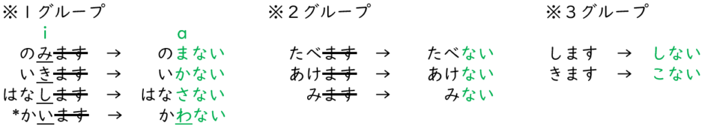- For Group 1 verbs, the last sound of the ます-form is always from the“i”line. To make the ない-form, change that sound to the“a”line.