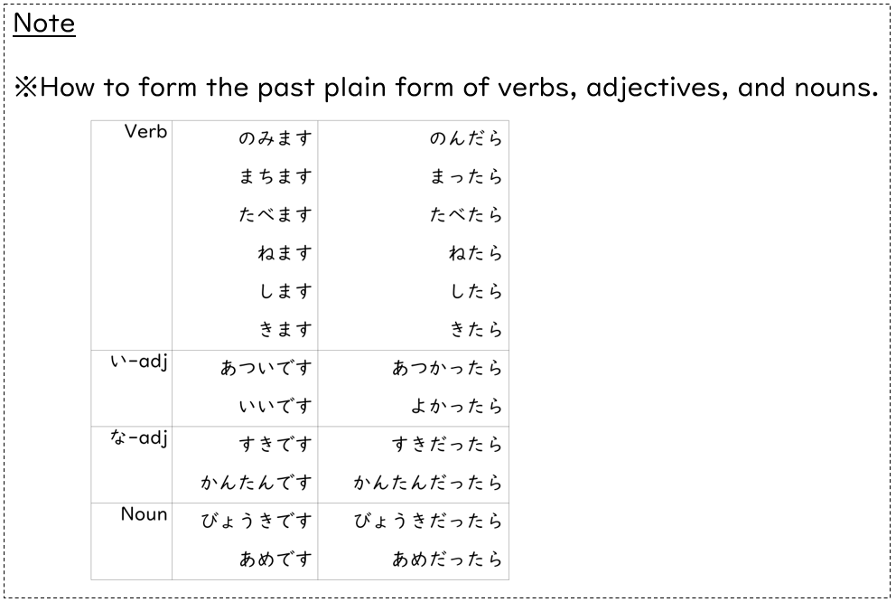- When「ら」is added to the past plain form of verbs, adjectives, or nouns, it becomes「~たら」and makes a conditional sentence. It means“if”.