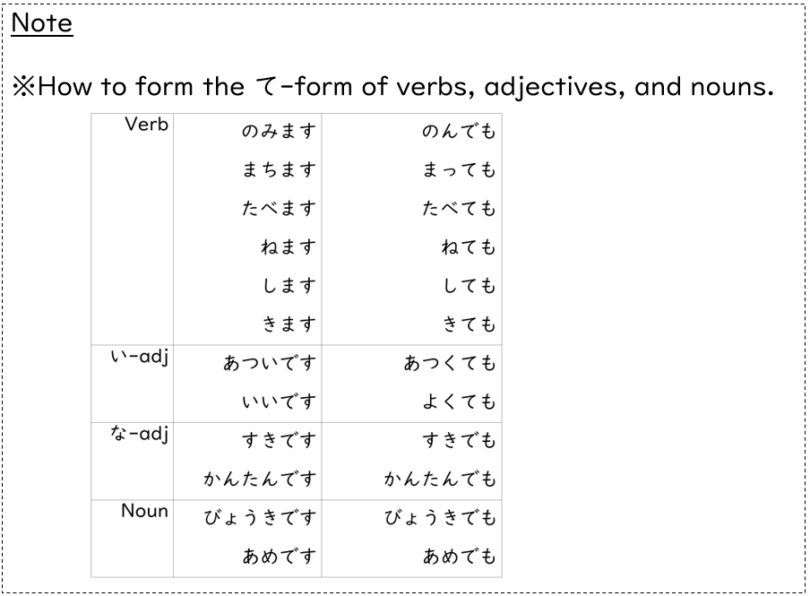 - “~ても”means“even if.”It shows that the result does not change even if something happens.